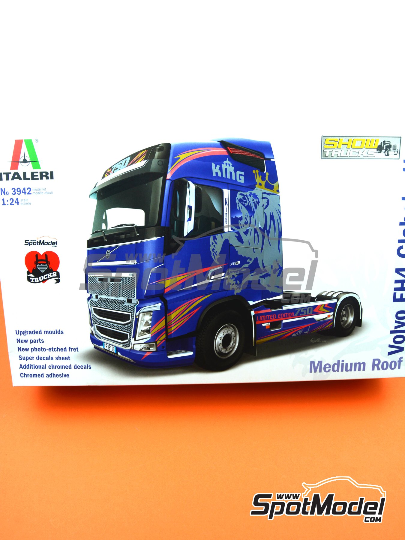 Spectacular scale model kit of the Volvo FH4 Globetrotter that includes a really impressive sheet of metal decals, a huge parts list, fully detailed chassis and engine, photoetched parts for the front grid, metallic vinyls, etc.