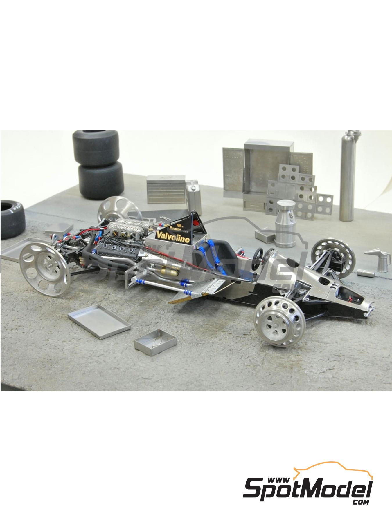 Rueda de simulación como las usadas por el equipo Lotus para el detallado de tus modelos de Fórmula 1 a escala 1/20 de la década de los 70. Este tipo de ruedas se empezaron a usar para realizar la configuración del set-up y llevar a cabo un alineado preciso, tanto en convergencia como en caídas. El complemento perfecto para usar a la hora de preparar dioramas de operaciones de reparación y mantenimiento en boxes.