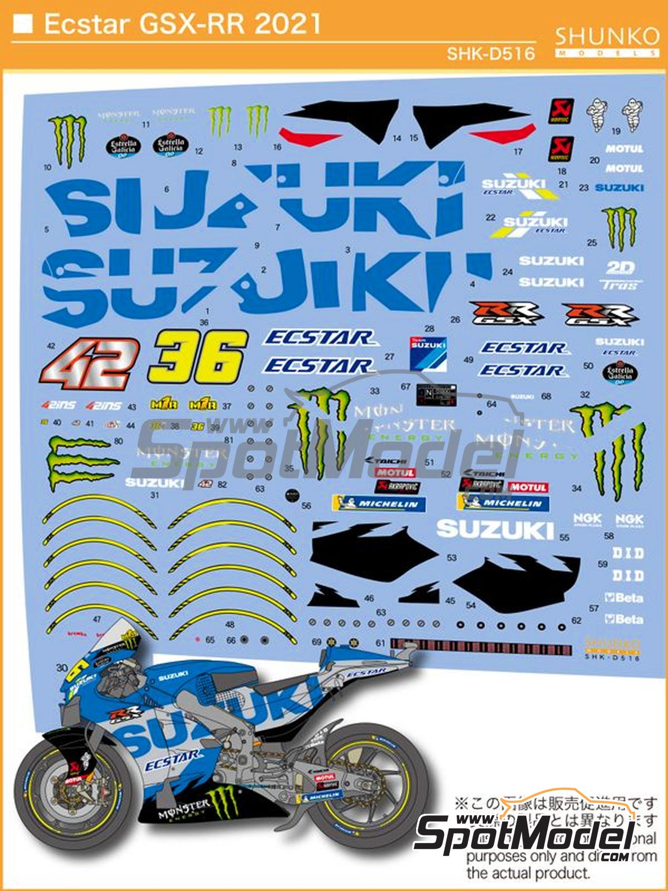 Esta referencia de calcas permite realizar la versión de 2021 de la Suzuki GSX-RR, y más concretamente las que corrieron en el Gran Premio de Estiria, décima prueba de la temporada disputada en el circuito Austriaco del Red Bull Ring, donde Joan Mir subía al podio en segunda posición. Además de añadir las calcas de los nuevos patrocinadores usados en 2021, se han cuidado los colores y los degradados para una reproducción más fiel de la moto real.
