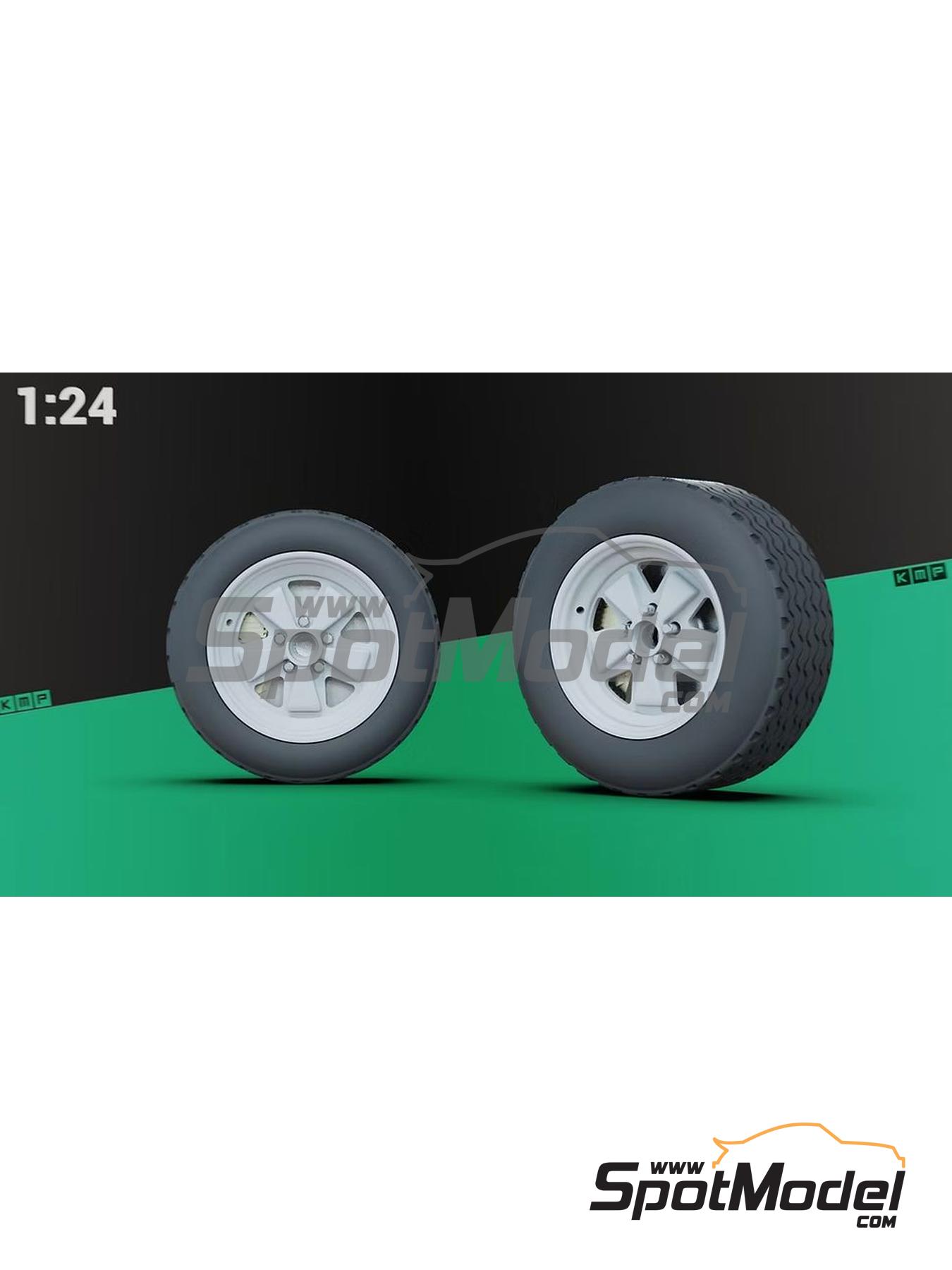 Complete wheel set for Nunu's scale model kit of the Porsche 911 SC RS. This set is designed to reproduce the gravel versions, with the wheels designed to be 100% accurate to scale, thus replacing the model's existing wheel set and improving the fidelity of the tire design. All parts are 3D printed, and include treaded gravel tires, brake discs and calipers with different size depending on whether they are mounted front or rear, and Fuchs rims. For a completely realistic finish, the model's height must be slightly adjusted.