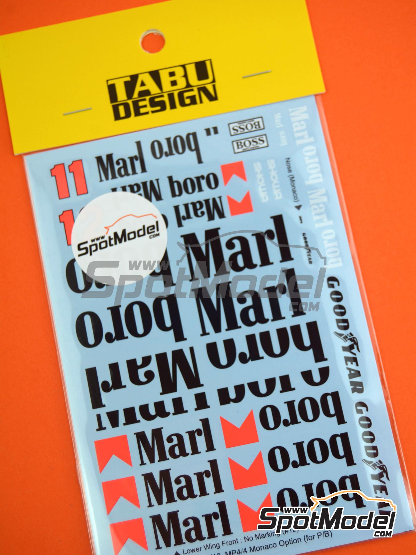 The new 1/12 scale kit of the McLaren MP4/4 recently released by Beemax doesn't include the tobacco advertising decals or some other Goodyear or Boss logos. But don't worry, Tabu Design has designed a