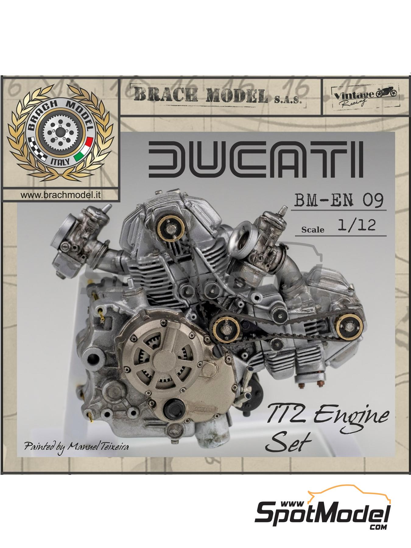 El fabricante Brach Model nos ofrece ahora la posibilidad de montar por separado fantásticas reproducciones de los motores incluidos en sus maquetas. Auténticas obras de ingeniería de su tiempo, que podrás exhibir gracias a la base, el soporte y la placa con pegatina con la descripción del motor que se incluyen. Esta referencia permite montar el motor de la Ducati TT2 de 1982.