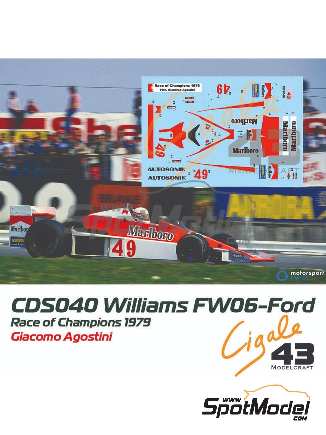 use on Tameo Kits scale model kits of the Williams Ford FW06 will allow you to reproduce the version used in the 1979 season at Brands Hatch, where they shared the grid with some of the regulars of the Formula 1 World Championship. The race was won by Gilles Villeneuve in his Ferrari 312 T3, while Agostini finished in eleventh position, fifth among the British drivers.