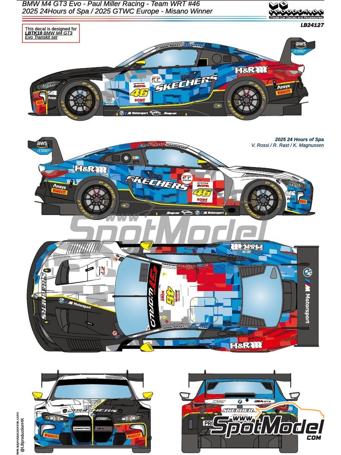 Decal sheet for reproducing the versions of the BMW M4 GT3 from the WRT team, which participated in various GT races and championships during the 2025 season. This set allows you to choose between two versions, both driven by Valentino Rossi, but with different teammates. In the Misano race, part of the GT World Challenge Europe Sprint series, and with Raffaele Marciello as his co-driver, the team took the victory in the first race. The second livery is the one that competed in the 24 Hours of Spa, where it finished in eleventh place with the experienced Kevin Magnussen and René Rast as co-drivers. This decal sheet allows you to reproduce this version using the Nunu scale model kit as a base and includes a set of carbon fiber pattern decals for the bodywork. To reproduce the Evo version in full detail, LB Production has developed a transkit,