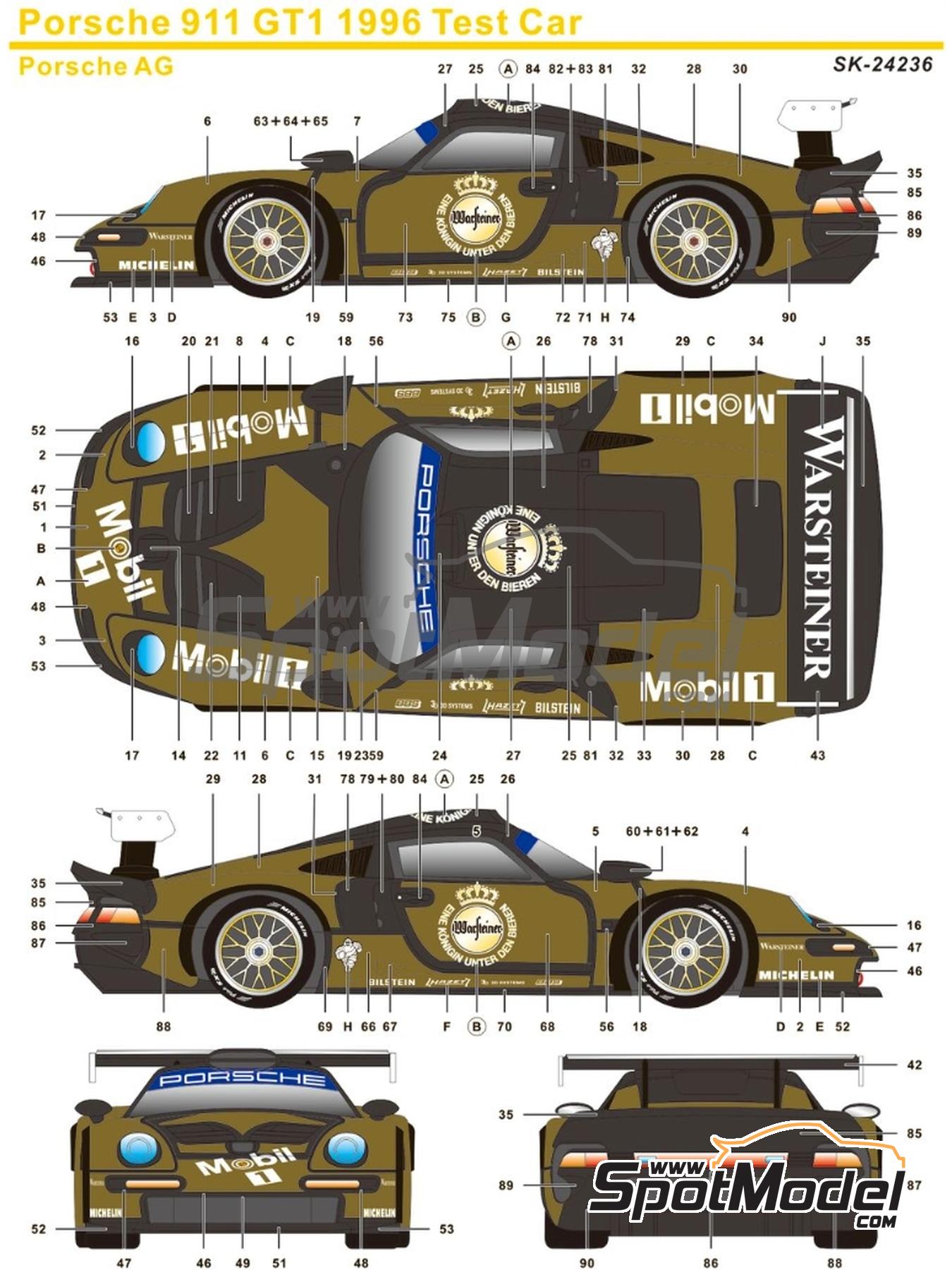 varias hojas de calcas de carbono más una hoja con los logos de los sponsors, algunos de ellos con acabado cromado. Sin duda, una de las versiones más llamativas del Porsche 911 GT1.