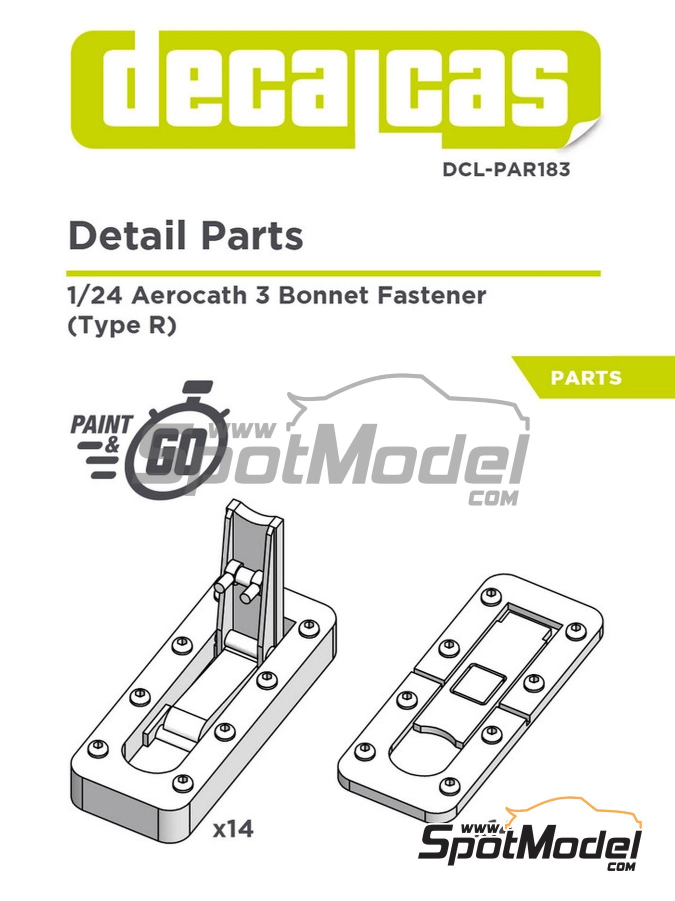 Set of 1/24 scale Aerocath 3-type hood latches (rectangular). Includes 14 open and 14 closed latches, along with a template for easy installation. Add a touch of realism to your model with these 3D-printed hood latches, which feature meticulous attention to detail. With the usual high quality of DECALCAS products, and the convenience of not requiring primer to ensure the pieces retain their detail, simply paint and mount them onto your scale model.