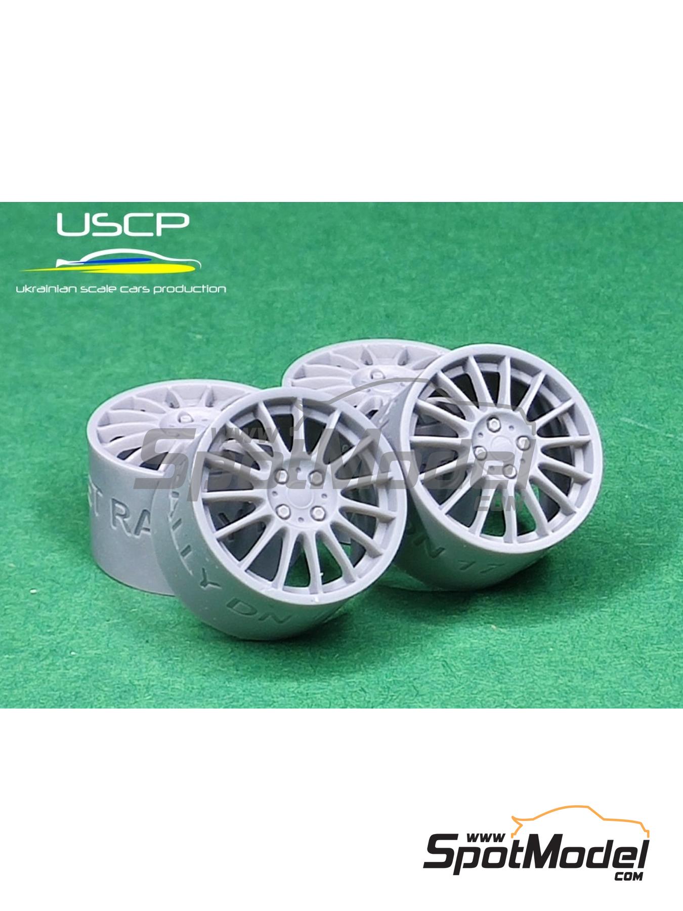 Set of four 1/24 scale 3D-printed resin rims with a design similar to that used on the 17-inch ATS Streetrallye rims. A set of treaded rubber tires is included. The set also includes various adapters so the wheels can be mounted on models from the most common manufacturers, such as Tamiya, Hasegawa, or Aoshima. The adapter holder also includes the rim air valves.