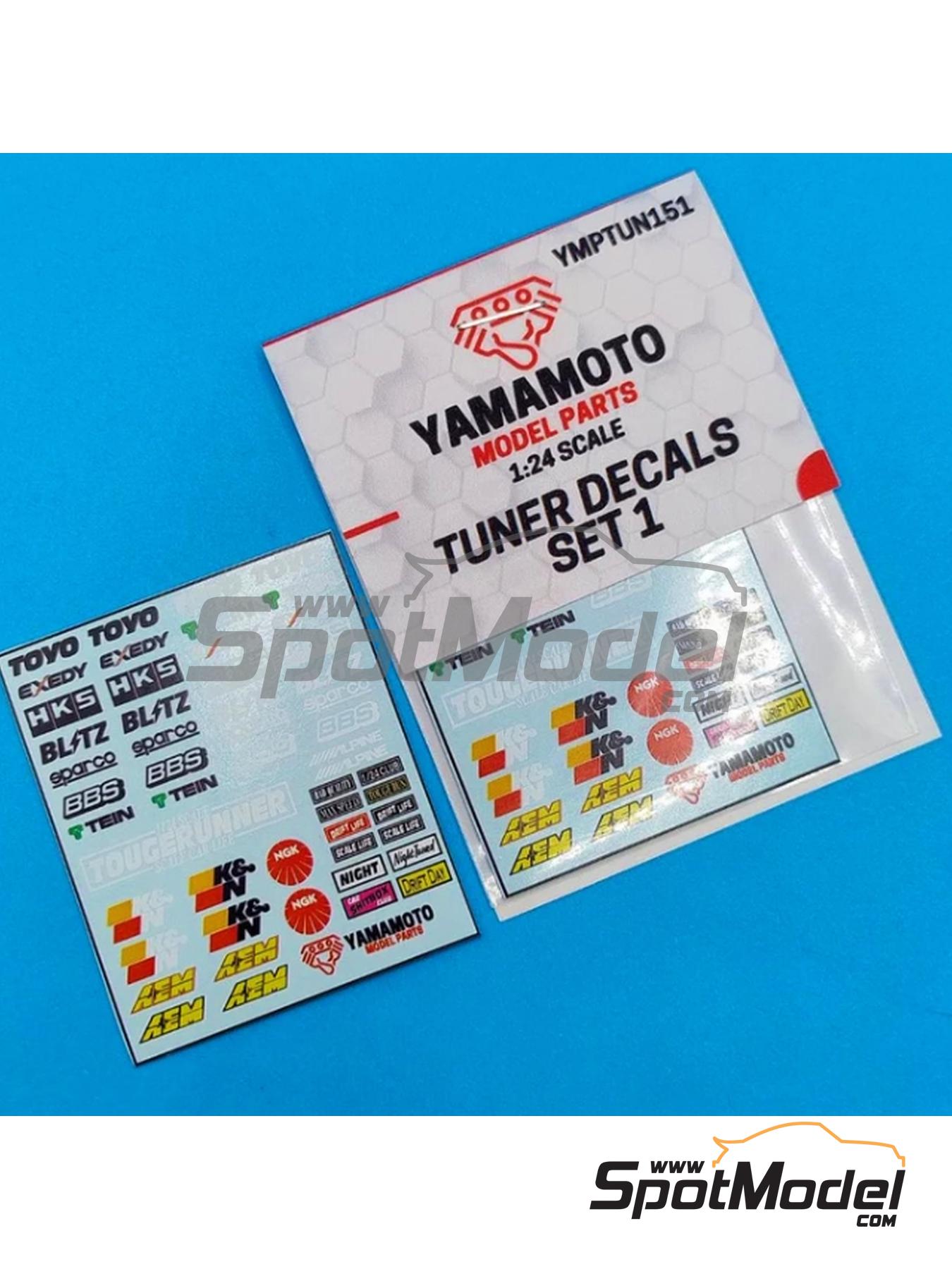 Decal sheet with logos from various automotive accessory manufacturers, such as Toyo, Exedy, HKS, BLITZ, Sparco, BBS, Tein, K&N, AEM, NGK, Alpine, ... ideal for decorating your models.