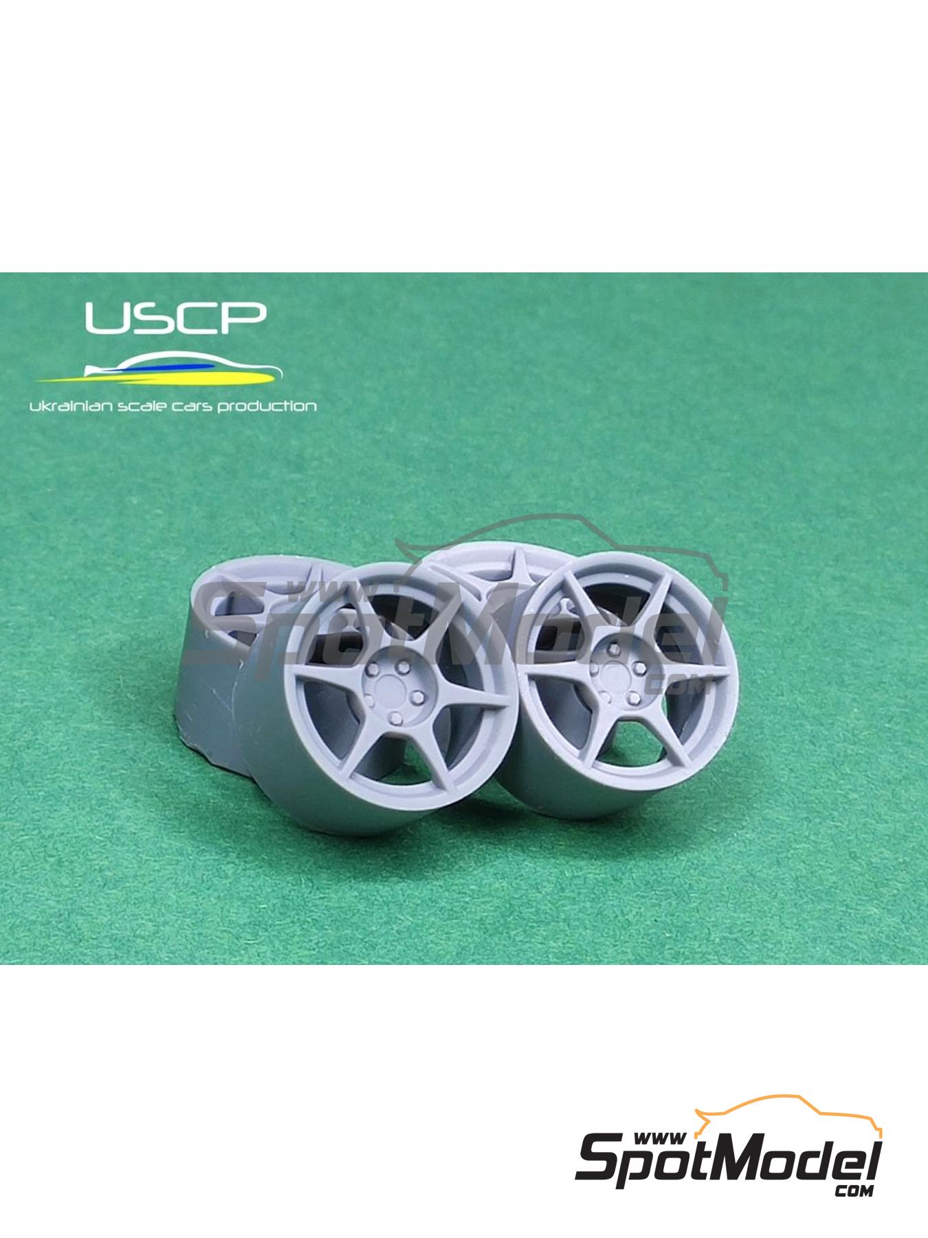Juego de 4 llantas en resina impresas en 3D a escala 1/24 con un diseño similar al usado en las llantas de 17 pulgadas Kosei Buddy Club P1-Racing. Se incluye un juego de neumáticos de goma con dibujo. El set incluye también diferentes adaptadores, de forma que las ruedas puedan montarse en las maquetas de los fabricantes más habituales, como Tamiya, Hasegawa o Aoshima. En el soporte de los adaptadores también se incluyen las válvulas de aire de las llantas.
